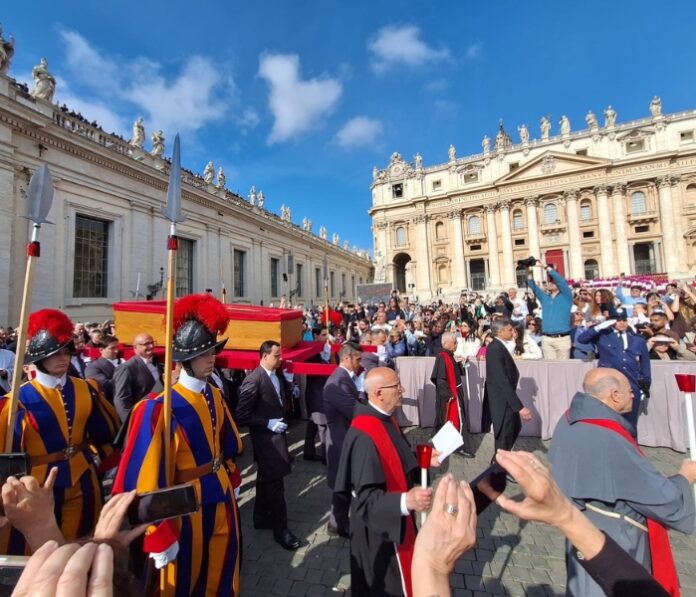 The Rite of Translation is the procession to move the body of a pontiff or other holy person from one place to another. The papal Rite of Translation took place on Wednesday, Apr. 23, processing from Casa Santa Marta, the place where Pope Francis both lived and passed away, through St. Peter’s Square and into the basilica.