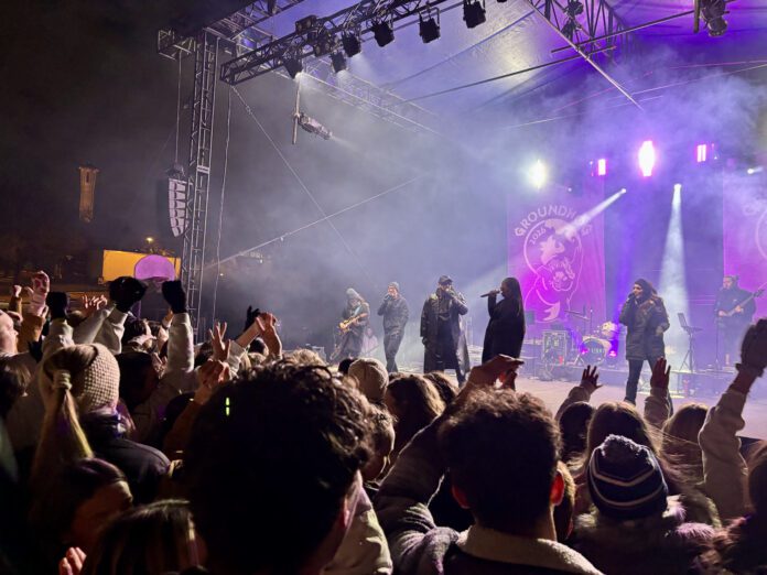 Student band Mall Culture began their set at 8pm, and played until 8:45. Said junior Mally Holleman, vocalist for the band: “Layering up and trying to jump around a lot before we started and moving during the performance definitely helped [us stay warm], but I’m pretty sure none of us were actually warm up there. Fingers and toes were pretty numb by the end which made holding the mic more tricky.”