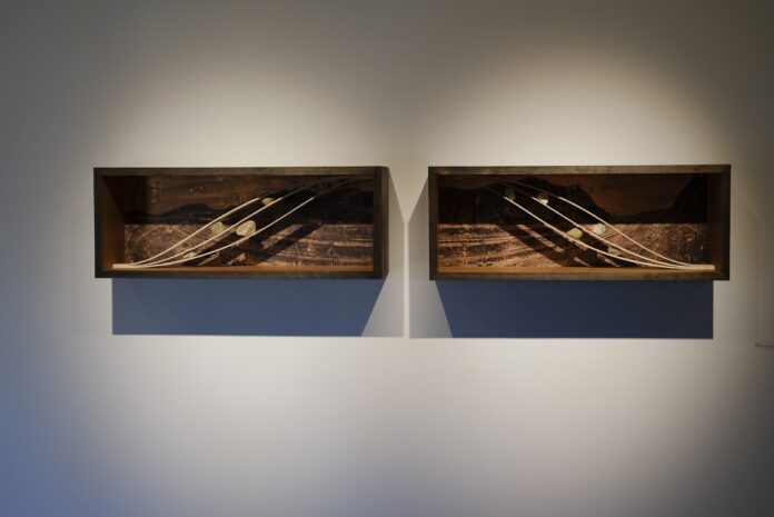 This is especially evident in his piece “Divide.” It is a diptych of sorts, and in the background there is an image of train tracks going between mountains represented through ink on metal leaf. In the foreground is a three-dimensional sculpture made of thin, smooth pieces of wood, which mimics the railroad. Stones are fitted carefully in between the thin wood pieces.