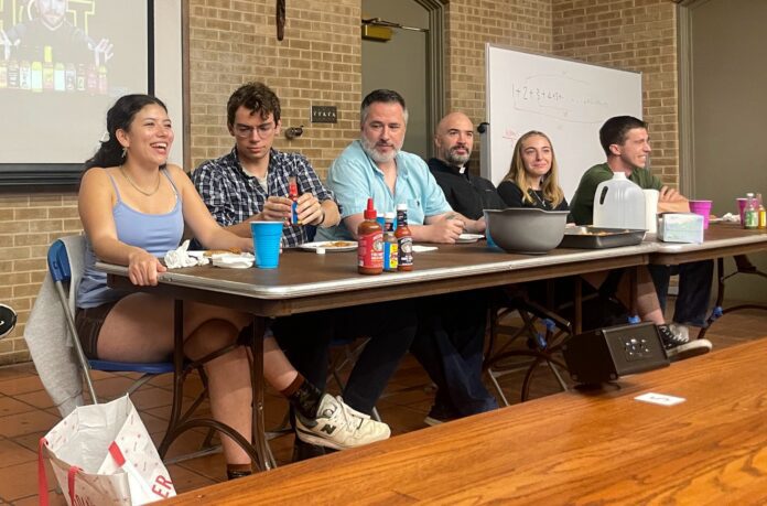 The Campus Ministry’s Hot Ones Panel on March 4 was a continuation of a five-year long tradition here at UD, where our chaplain, Fr. Jeronimo, Deacon Ryan and a handful of RAs partook in a tongue blistering challenge: eating progressively spicier chicken wings as they were asked personal questions, questions about their past experiences and about their likes and dislikes, while panelists tried to focus as the heat stung their senses. Students were able to submit their questions beforehand in a Google Form linked to QR codes on the posters hanging around campus.